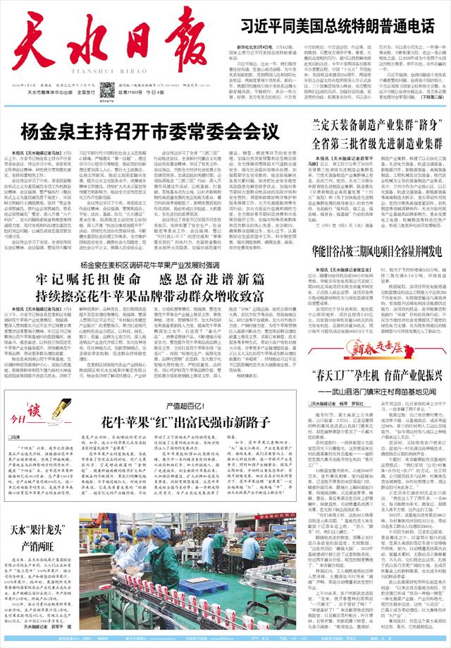 本报讯【天水融媒记者马放】2月4日下午,市委书记杨金泉在麦积区专题调研花牛苹果产业发展情况。他强调,要深入贯彻落实习近平总书记视察甘肃重要讲话重要指示精神,牢记总书记视察南山花牛苹果基地时的殷殷嘱托,接续奋斗,感恩奋进,以科技引领促进花牛苹果产业全链条提升,持续擦亮花牛苹果品牌,带动更多群众增收致富。