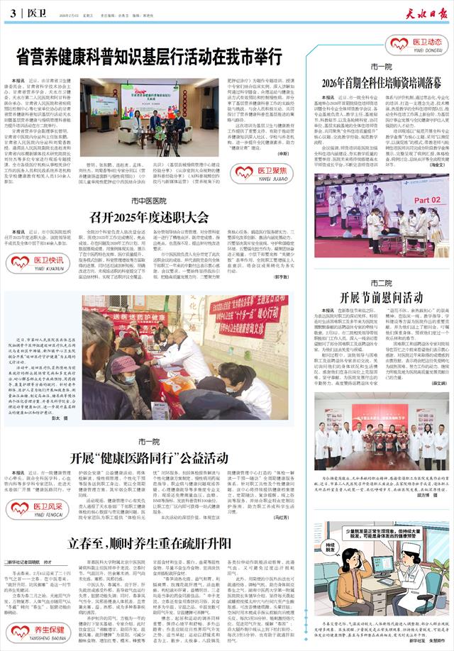 本报讯 近日,由甘肃省卫生健康委员会、甘肃省科学技术协会主办,甘肃省营养学会、天水市卫健委、天水市第二人民医院和阿甘科普联合承办,甘肃省人民医院和省疾病预防控制中心等七家单位协办的甘肃省营养健康科普知识基层行活动天水站暨基层营养健康与慢病管理科普能力提升培训活动在市二院举行。