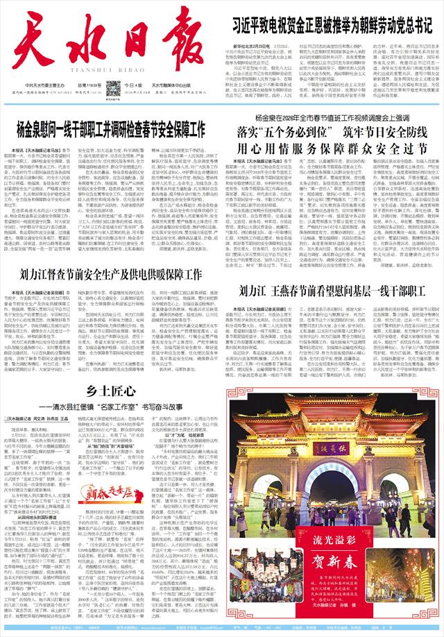 本报讯【天水融媒记者马放】春节假期第一天,市委书记杨金泉在市应急指挥部主持召开2026年全市春节值班工作视频调度会,听取春节期间值班值守和安全稳定情况汇报,分析研判安全稳定形势,对春节假期各项工作再动员、再部署、再压实,并代表市委、市政府向春节期间坚守一线、辛勤工作的广大干部职工致以新年的美好祝福。