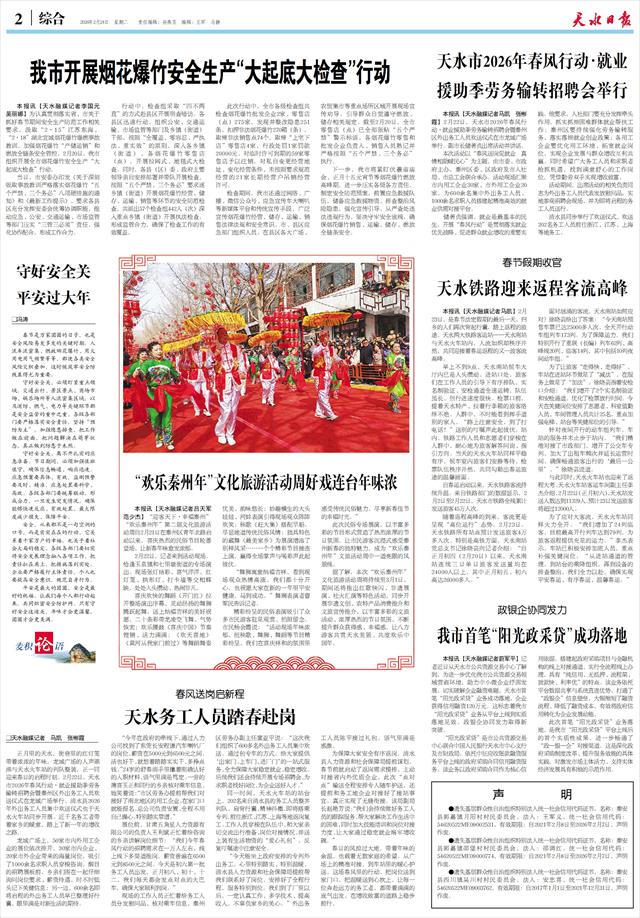 据了解,本次“欢乐秦州年”文化旅游活动周将持续至3月1日,期间还将推出红歌快闪、非遗展演、社火汇演等特色活动,同步开展非遗文创、农特产品消费推介和文旅宣传推介,以丰富多彩的文旅活动、浓厚热烈的节日氛围,不断提升群众获得感、幸福感,让八方游客共赏天水美景、共度欢乐中国年。