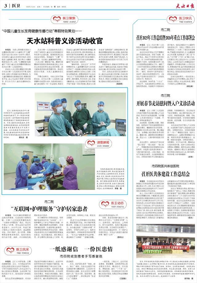 本报讯 近日,市第三人民医院工作组开展春节走访慰问暨入户义诊活动,用实际行动传递温情、守护健康,让关爱对象度过一个温暖、平安、祥和的新春佳节。