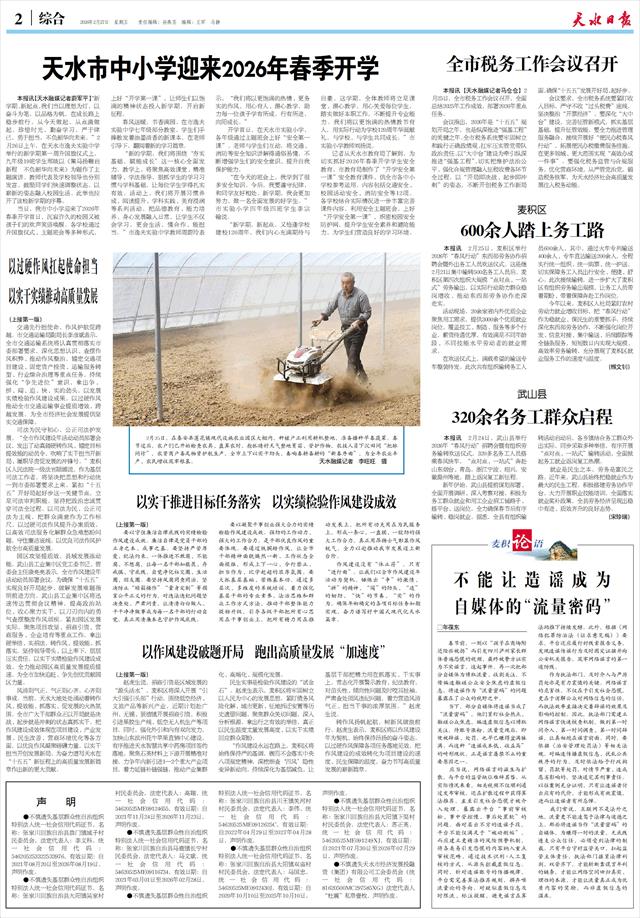 全市税务工作会议召开   本报讯【天水融媒记者马仓仓】2月25日,全市税务工作会议召开,全面总结2025年工作成效,部署2026年重点任务。