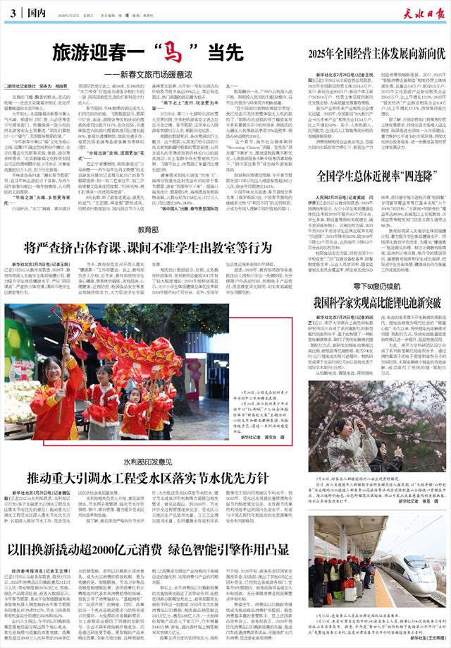 天水市中小学迎来2026年春季开学   本报讯【天水融媒记者蔚军平】“新学期,新起点,我们当以理想为灯,以奋斗为笔,以品格为帆,在成长路上稳步前行。从今天做起,从点滴做起,珍惜时光,勤奋学习,严于律己,勇于担当,不负韶华向未来。”2月26日上午,在天水市逸夫实验中学举行的新学期第一周升国旗仪式上,九年级19班学生邢琰以《策马扬鞭启新程 不负韶华向未来》为题作了主题演讲。教师代表及学校领导也分别发言,鼓励同学们快速调整状态,以崭新的姿态融入校园生活。此举也拉开了该校新学期的序幕。
