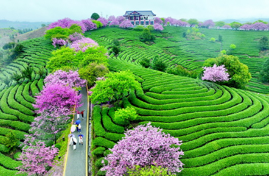 3月2日,游客在福建省漳平市永福镇台品樱花茶园游玩(无人机照片)。