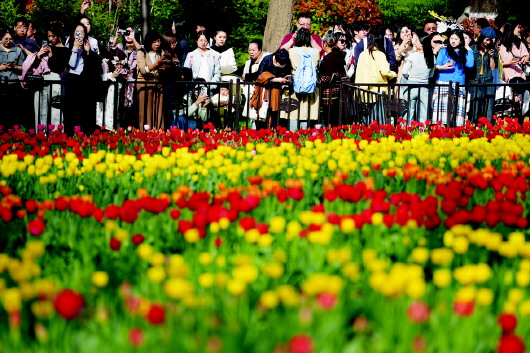 3月29日,游人在西安市兴庆宫公园观看郁金香花展。