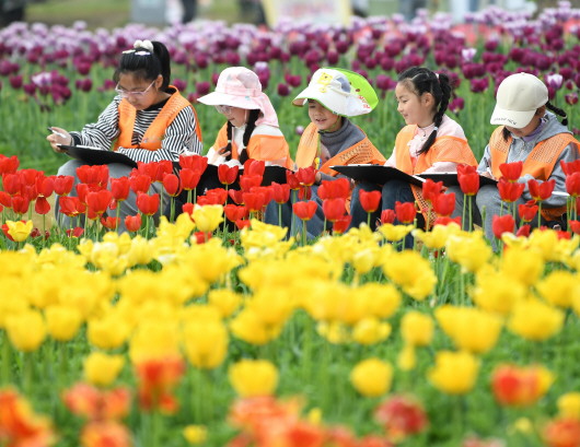 4月2日,在安徽巢湖经济开发区半汤郁金香高地,小朋友参加春假写生活动。春假期间,同学们走出课堂,在丰富多彩的实践活动中拓宽眼界,度过健康快乐、富有收获的假期。 新华社发(马丰成摄)