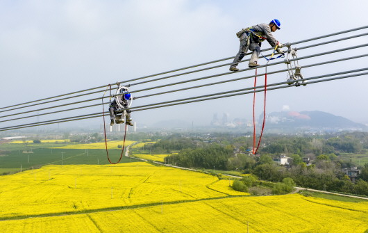 4月2日,在安徽省芜湖市繁昌区境内,安徽送变电工程有限公司施工人员在甘肃—浙江±800千伏特高压直流输电工程施工现场作业(无人机照片)。甘肃—浙江±800千伏特高压直流输电工程是国家“十四五”电力发展规划重点工程,线路全长2370千米,工程贯通后每年可输送电能约360亿千瓦时。