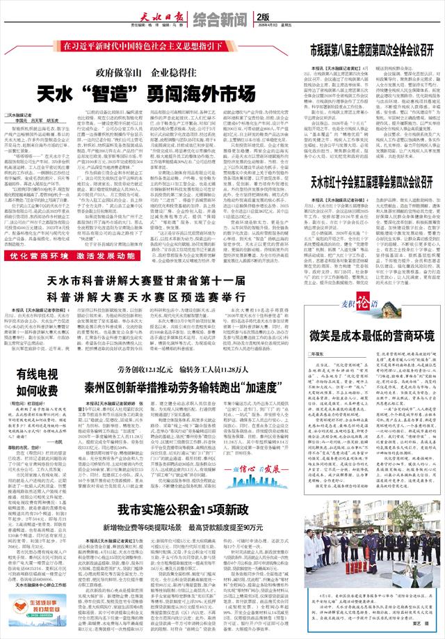 营商环境是软实力,更是生产力。从车间里的智能升级,到全链条的数字化改造;从政府靠前服务的暖心举措,到天水“智造”扬帆出海的坚定步伐,天水正以更优的营商环境、更强的创新动能,持续拓宽外向型经济发展新赛道,为全市经济高质量发展注入源源不断的开放活力。