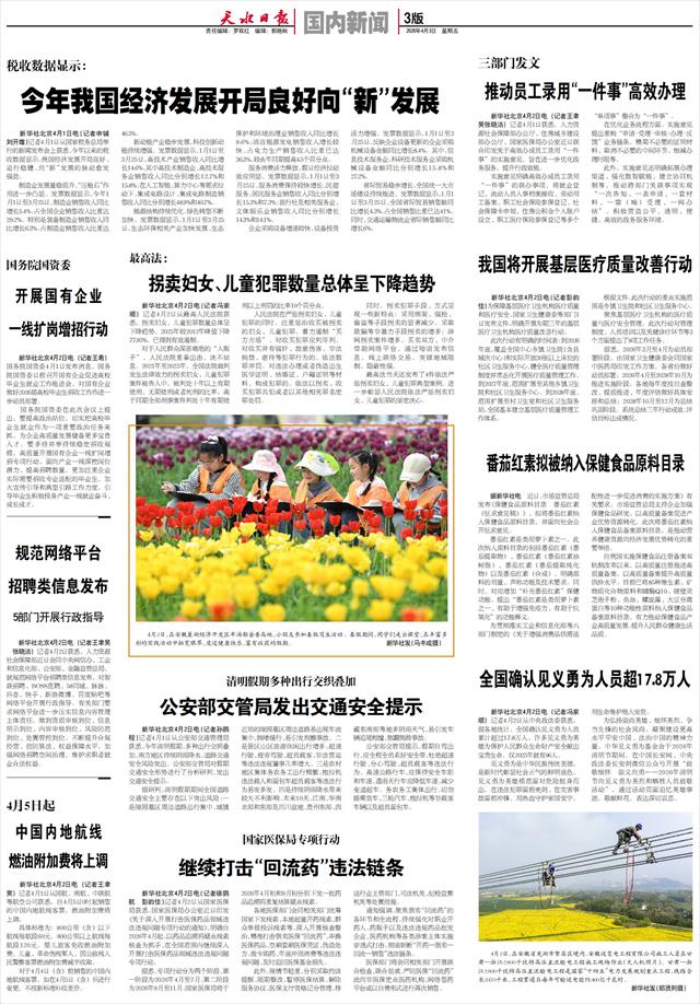 税收数据显示: 今年我国经济发展开局良好向“新”发展   新华社北京4月1日电(记者申铖 刘开雄)记者4月1日从国家税务总局举行的新闻发布会上获悉,今年以来的税收数据显示,我国经济发展开局良好、运行稳健,向“新”发展的脉动愈发强劲。