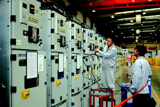 4月10日,在天水长城开关厂集团有限公司中压空气绝缘开关设备数字化车间(AIS)生产现场,员工严把质量关,对即将出厂交付的KYN28A-12型开关柜产品进行调试。