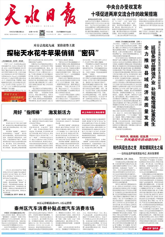 亮眼成绩的背后,是我市持续推动花牛苹果产业全链条高质量发展的扎实举措。近年来,我市不断完善流通体系,建成农产品产地批发市场61个,果品冷库贮藏能力突破100万吨,智能自动化分选生产线累计达21条,大幅提升分级分选效率与精度。同时,强化“天水花牛苹果”区域公用品牌保护,积极搭建宣传推介平台。目前,天水苹果远销东南亚、中东、俄罗斯等30多个国家和地区,“天水花牛苹果”品牌价值达68.88亿元,成功纳入2025年农业品牌精品培育计划。