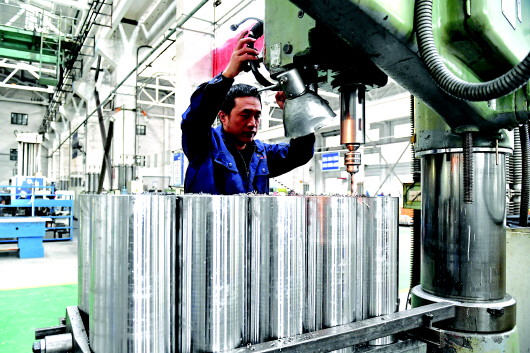 4月13日,天水锻压机床(集团)有限公司的工人正在车间加工产品部件。