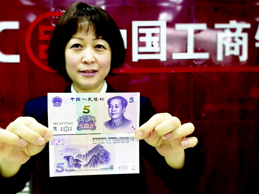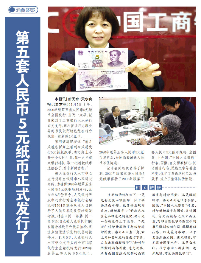 本报讯【新天水·天水晚报记者常亮】11月5日上午,2020年版第五套人民币5元纸币全国发行,当天一大早,记者来到了工商银行天水分行东关支行,正在营业厅办理业务的市民张阿姨已经在柜台取出一把新款5元纸币。
