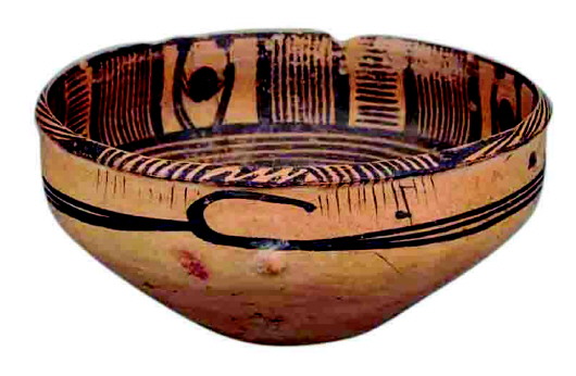 马家窑文化因1924年首次在甘肃省临洮县马家窑村古文化遗址发现而得名。马家窑文化是一种受关中地区仰韶文化影响发展起来的新石器时代文化,它的陶器形制特征近似仰韶文化,但它是具有明显地方特征的一种文化。马家窑文化主要分布在甘肃和青海东北部一带,其年代据碳-14测定,约为公元前3190—前1715年。已发掘的马家窑文化遗址,有兰州曹家嘴和青海乐都湾等数处。如上图所示这件双人抬物纹彩陶盆,出土于青海省海南藏族自治州同德县宗日遗址,现藏于青海省博物馆。