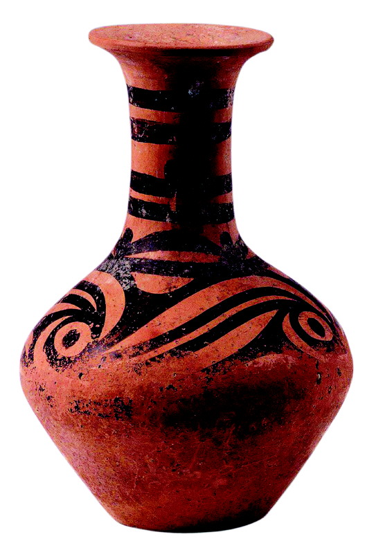 马家窑文化是一种以原始农业为主要社会经济生活的氏族社会文化,主要集中在今甘肃、青海一带,宁夏南部地区的固原、隆德、海原等地区有零星分布,属于该文化的边缘地带。马家窑文化的彩陶,通常是为了增加器表色彩的光泽,在陶坯的外表先上一层橙黄色的陶衣,然后用类似毛笔的工具蘸土以赤铁矿或氧化锰做的颜料,在上面精心描画出动物或植物的象征性图案。经过高温焙烧,赤铁矿或氧化锰颜料还原成为红色或黑色,变成埋藏在地下数千年而不脱落颜色的彩陶。宁夏博物馆收藏的这件新石器时代草叶鸟纹长颈彩陶瓶,即属马家窑文化。