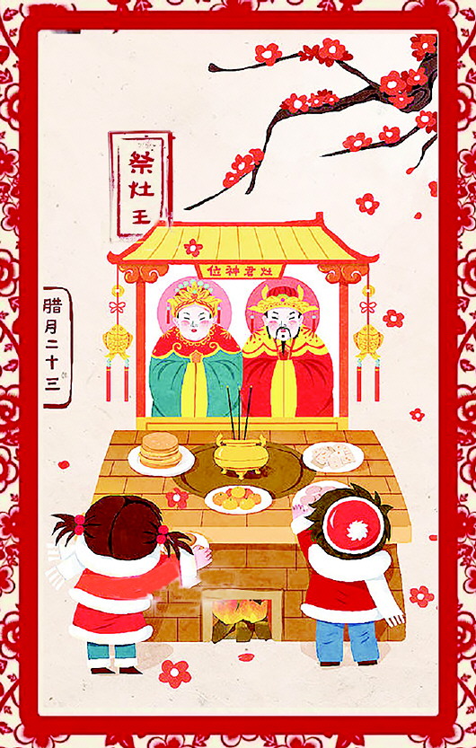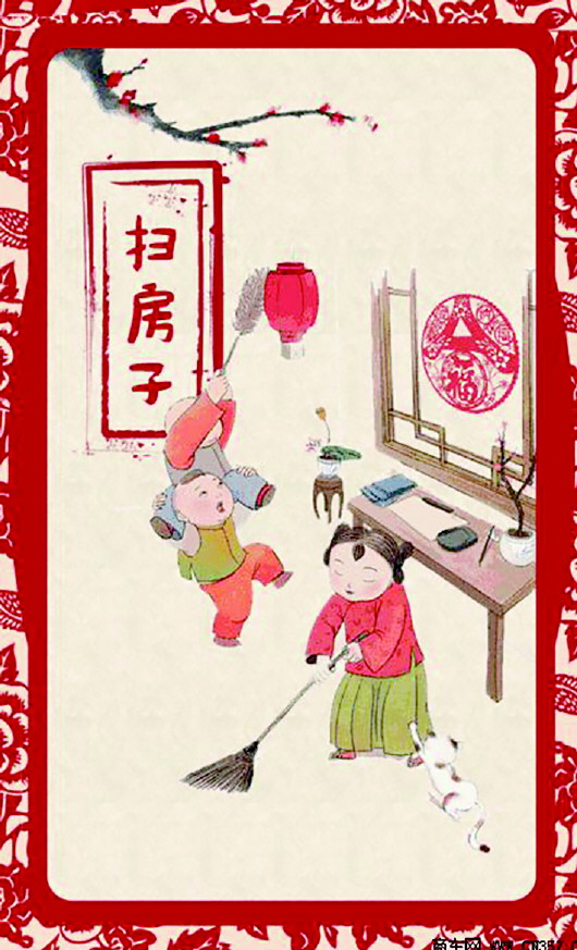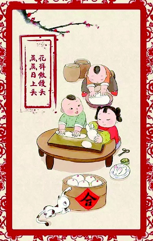 二十三,糖瓜粘;二十四,扫房子;二十五,做豆腐;二十六,炖猪肉;二十七,杀年鸡;二十八,把面发;二十九,蒸馒头;三十晚上玩一宿,大年初一扭一扭。