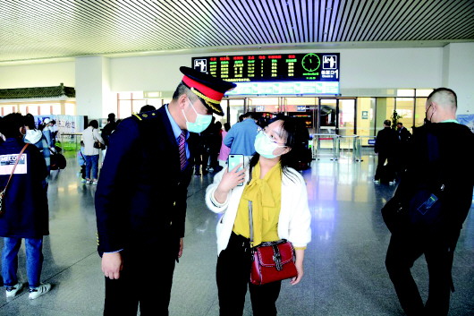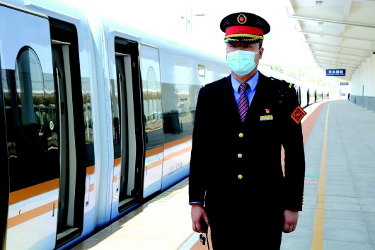 4月29日上午,在宝兰高铁天水南站的站台上,刘波忙碌地引导着等待乘车的乘客。大高个的他,身着西装,胸前佩戴着党徽,左臂戴着客运值班员的袖章,手里拿着对讲机,看上去十分帅气。