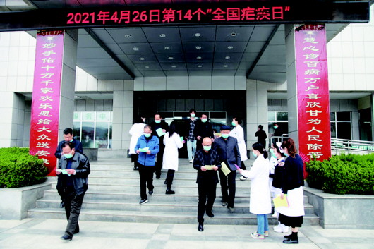 4月26日,市中西医结合医院(市二院)在住院部大楼前开展全国疟疾日宣传活动。