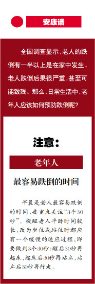 早晨是老人最容易跌倒的时间,要重点关注“3个30秒”。提醒老人平卧时间较长,改为坐位或站位时都应有一个缓慢的适应过程,即要做到3个30秒:醒后30秒再起床,起床后30秒再站立,站立后30秒再行走。