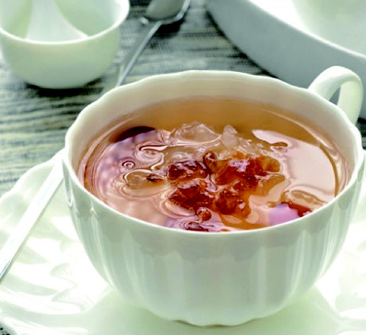 取桃胶15克,雪梨1个,银耳5—10克,冰糖30克。将桃胶放入清水中浸泡一夜,反复清洗后掰成大小均匀的块。将银耳用清水泡20分钟变软后掰成小朵。雪梨去皮切成丁,将桃胶、银耳和水放入锅中,大火煮开改小火继续煮1小时,放入梨丁煮5分钟,再加冰糖煮3分钟至彻底融化,放温即可食用。