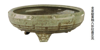 据考证,瓷器上出现八卦纹样最早出现于唐宋时期,但仅见有几个零星的例子,而元代以后八卦纹才在瓷器上流行,所以冯先铭主编的《中国古陶瓷图典》中说:“八卦纹大约在元代开始出现在瓷器上。”明清瓷器上的八卦纹样则更为常见,尤其多见这种龙泉窑青釉八卦纹洗或炉。