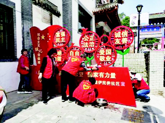 近日,秦州区中城街道办伊民巷社区新时代文明实践站为了积极培育和践行社会主义核心价值观,组织志愿者在辖区开展了“我为群众办实事”实践活动,大家用洗净的抹布将承载着社会主义核心价值观传递作用的一面面文化墙、一块块宣传牌上的尘土擦去,把核心价值观融入社区的每个角落中。