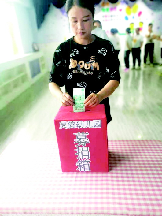 第二天早上,家长和孩子们早早来到幼儿园,自发为县卓峰母子募捐。