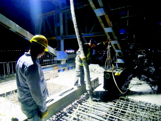 本报讯【新天水·天水晚报记者杨旭】 6月27日凌晨,由中铁十一局集团天水分公司承建的天水有轨电车示范线(二期),阳坡东藉河特大桥跨秦麦快速路连续梁顺利合龙。该大桥是天水有轨电车示范线(二期)全线唯一一处挂篮施工桥梁,也是全线最大的“拦路虎”,本次顺利合龙标志着天水有轨电车示范线(二期)主体工程施工取得了阶段性胜利。