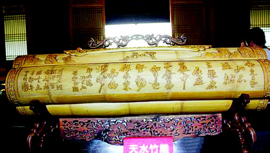 天水竹雕是流传于甘肃省天水市的一种传统手工艺术。竹雕也称竹刻,是在竹制的器物上雕刻多种装饰图案和文字,或用竹根雕刻成各种陈设摆件。天水的竹雕艺术作品将雕刻工艺高浮雕、低浮雕、镂空、圆雕融为一体,竹雕造型独特,品种繁多。2008年天水竹雕被列入甘肃省省级非物质文化遗产名录。