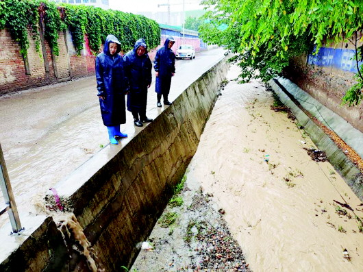 7月15日上午,秦州区七里墩街道五里铺社区组织工作人员冒雨行动,开展防汛安全隐患排查工作。