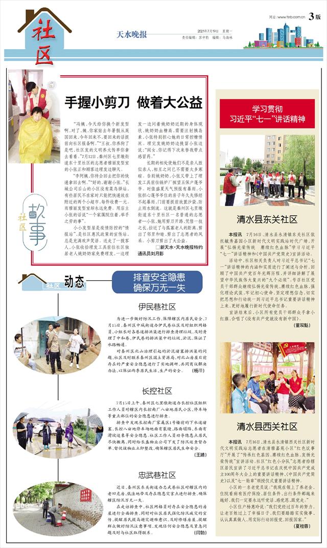 “冯姨,今天给你换个新发型啊,对了,姨,你家娃去年暑假从英国回来,今年回来不,要回来的话提前向社区报备啊。”“王叔,你养狗了是吧,社区发的文明养犬传单你拿去看看。”7月12日,秦州区七里墩街道东十里社区的志愿者雅丽发型室的小张正和顾客边理发边聊天。
