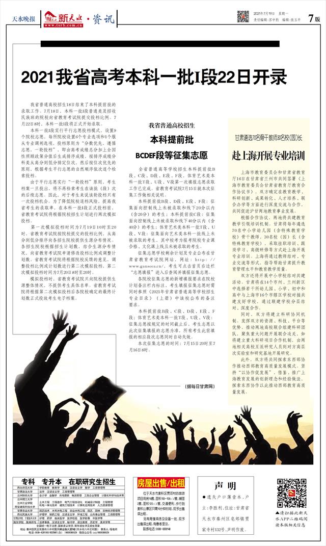 7月17日,2021年“三支一扶”计划和农村教师特岗计划基层服务项目考试(天水考区)举行。天水考区共有9328人参加考试,其中“三支一扶”项目4470人,“特岗计划”项目4858人。本次考试共设秦州区、麦积区10个考点。