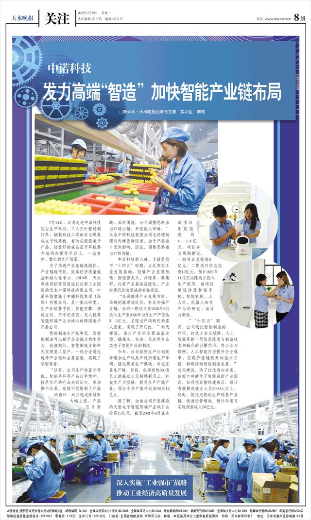 为了推进产业基础高级化、产业链现代化,提高经济质量效益和核心竞争力,2019年,天水市政府招商引资进驻社棠工业园区的天水中诺科技有限公司。中诺科技隶属于中疆科技集团(深圳)有限公司,是一家以研发、生产和销售手机、智能穿戴、移动支付、行车记录仪、无人机等智能终端产品为核心的跨国电子产品公司。