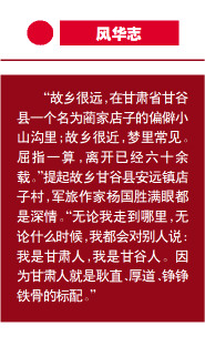 “故乡很远,在甘肃省甘谷县一个名为蔺家店子的偏僻小山沟里;故乡很近,梦里常见。屈指一算,离开已经六十余载。”提起故乡甘谷县安远镇店子村,军旅作家杨国胜满眼都是深情。“无论我走到哪里,无论什么时候,我都会对别人说:我是甘肃人,我是甘谷人。因为甘肃人就是耿直、厚道、铮铮铁骨的标配。”