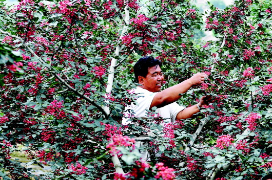 张满生穿着一件白汗衫,正忙着和工人们一起摘椒,额头上挂着汗珠子。工人们手上都戴着指套,他却是徒手采摘,双手的拇指和食指都被染成了黑色,手腕和胳膊上也有多处划痕。“为了保证花椒的成色,趁着伏天天气好,要抓紧采摘、烘干、晾晒,白天晚上连轴干,一点儿不轻松啊!”张满生说,自己种的350株花椒树大多在盛果期,摘椒的时节忙得吃不好、睡不好,但心里一想到花椒拿到市场上换成钱的时候,还是觉得“累并快乐着”。