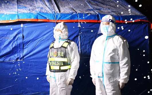 11月6日,我市气温骤降,天气一下子变得异常寒冷,天空中飘起了雪花,当防疫遇上寒冬,无疑是更加严峻的考验。我市广大党员干部、医护人员、警察、志愿者等疫情防控工作人员,不辞辛劳,奔波在防控和保障的第一线。