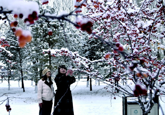 ↑11月6日,酒泉市肃州区市民在欣赏雪景。 据新华社/万宗平摄