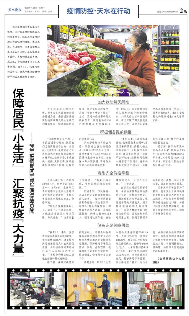 “截至6日,秦州、麦积两区储备各级成品粮3975吨、食用植物油525吨,储备粮可满足城区居民人口22天的供应量,食用植物油可满足城区居民人口34天的供应量。”市粮食和物资储备局粮食储备科科长高鹏说。