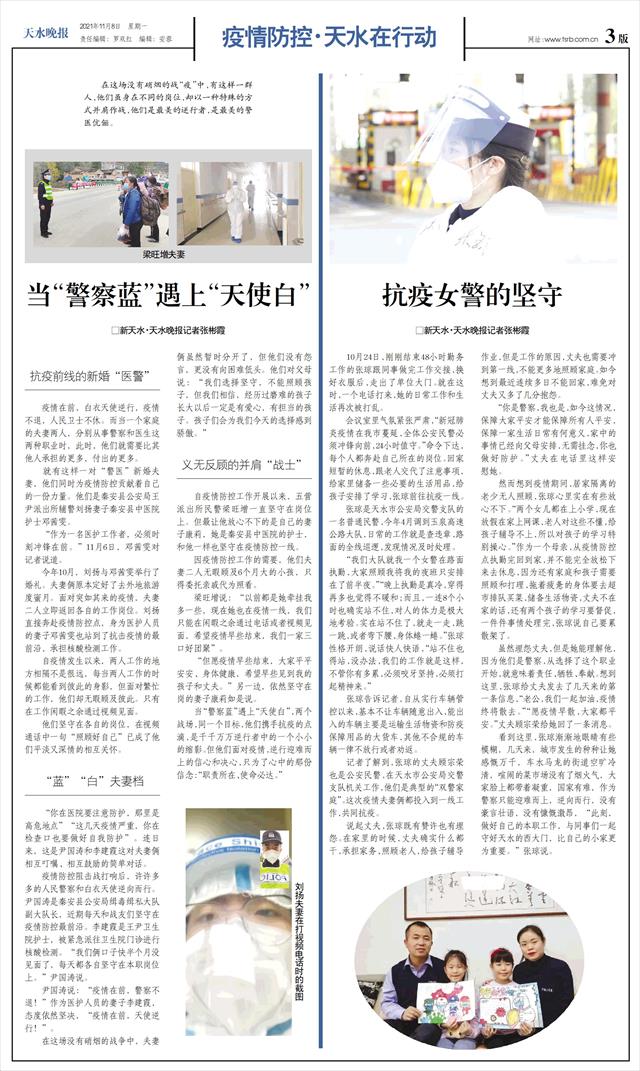 记者了解到,张琼的丈夫顾宗荣也是公安民警,在天水市公安局交警支队机关工作,他们是典型的“双警家庭”。这次疫情夫妻俩都投入到一线工作,共同抗疫。