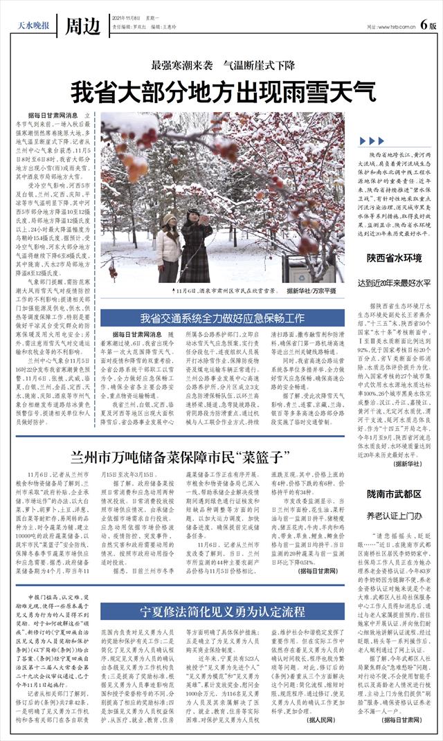 据每日甘肃网消息 随着寒潮过境,6日,我省出现今年第一次大范围降雪天气。面对疫情和降雪的双重考验,全省公路系统干部职工以雪为令,全力做好应急保畅工作,确保全省各主要公路安全、重点物资运输畅通。