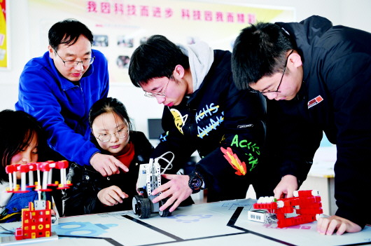 11月22日,白河高级中学老师(左二)在指导机器人制作社团的学生活动。机器人社团自2015年以来获得各类教育机器人大赛奖项60多个。