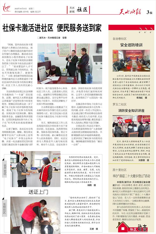 社保卡激活进社区 便民服务送到家 □新天水·天水晚报记者 安蓉   “阿姨,您外孙的社保卡需要监护人带着自己的身份证,孩子的户口簿前往就近的秦州农村合作银行办理激活,激活成功后再到微信小程序搜索电子社保卡,在电子社保卡里找到亲情服务把孩子的社保卡添加进去就可以了。”“原来要监护人才可以,那我就让孩子的妈妈去,我也不用跑冤枉路了,谢谢你们。”日前,家住新华家苑居民赵阿姨到秦州区天水郡街道西十里社区询问外孙社保卡的相关事宜时,社区工作人员向居民耐心讲解。