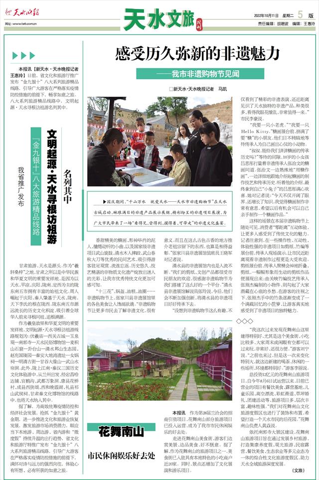 感受历久弥新的非遗魅力 ——我市非遗购物节见闻□新天水·天水晚报记者 马凯   香甜精美的糖画、形神毕肖的泥人、缱绻动听的小曲,以及国家级非遗项目武山旋鼓、清水木人摔跤、武山春秋大刀等优秀的民间艺术,吸引得游客驻足观赏,流连忘返。历史悠久、技艺精湛的非物质文化遗产绽放出迷人的光彩,让我市优秀传统文化更加可感可知。