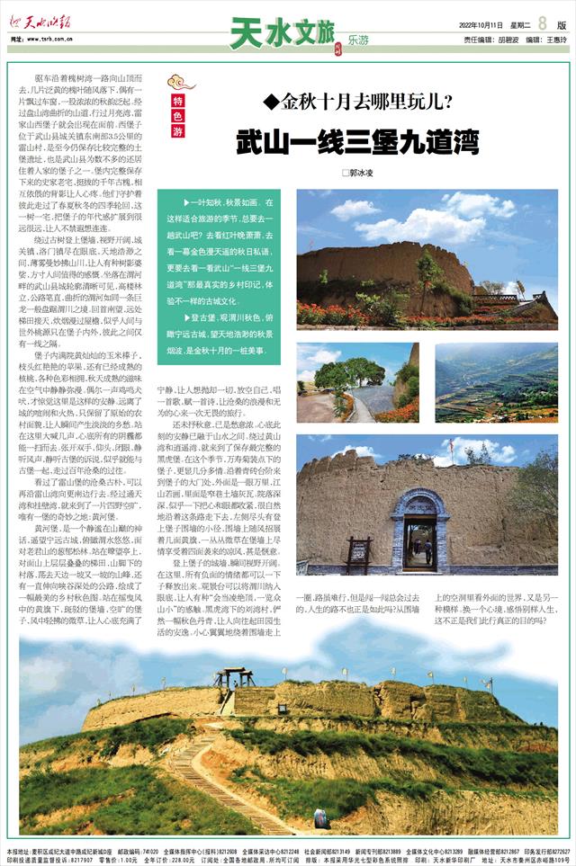 ◆金秋十月去哪里玩儿? 武山一线三堡九道湾□郭冰凌   驱车沿着槐树湾一路向山顶而去,几片泛黄的槐叶随风落下,偶有一片飘过车窗,一股浓浓的秋韵泛起。经过盘山湾曲折的山道,行过月亮湾,雷家山西堡子就会出现在面前。西堡子位于武山县城关镇东南部3.5公里的雷山村,是至今仍保存比较完整的土堡遗址,也是武山县为数不多的还居住着人家的堡子之一。堡内完整保存下来的史家老宅、挺拔的千年古槐,相互依偎的背影让人心疼。他们守护着彼此走过了春夏秋冬的四季轮回,这一树一宅,把堡子的年代感扩展到很远很远,让人不禁遐想连连。