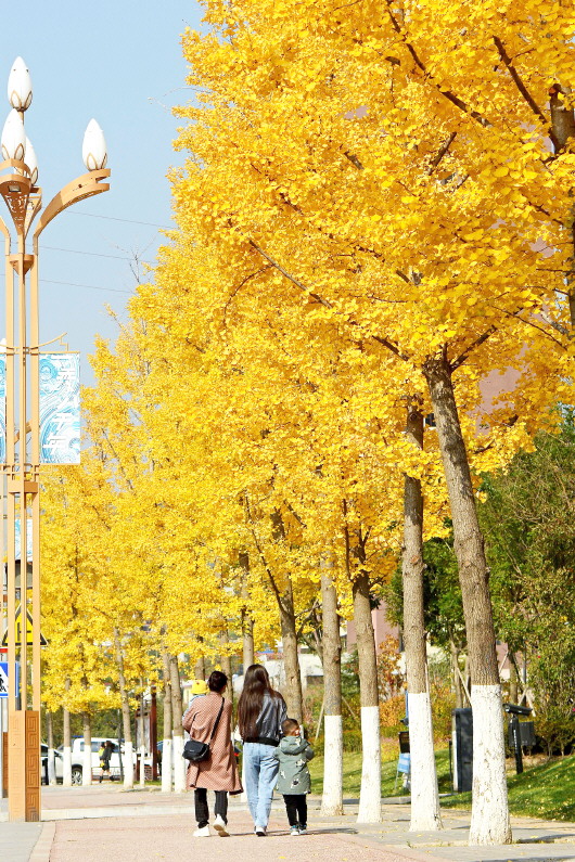 深秋,天水最美的时候。成纪大道、秦州大道,金黄色树叶装点的每一条街道,都是景观长廊。天水湖畔、乡野山坡,赤橙黄绿青蓝紫渲染出一幅幅七彩油画,大自然的调色板,让天水的秋季无比绚烂。图为成纪大道秋景。