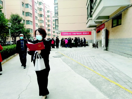 秋末的上午寒气逼人,但小区院内暖意融融,居民个个喜笑颜开,大家逐一签字、亮出身份证,开心领取真正属于自己的不动产权证,纷纷叫好并感慨赞叹:“今天终于拿到房产证了,归属感强了,实在太高兴了!”“党和政府就是好,咱们花大钱买的房子住了十几年都没合法手续,现在这事是办到咱们心坎上来了。”“有这个红本本在手,心里一下踏实了,我们这么多人牵扯的房屋继承、孩子就学、居住安心等等问题都不愁了,生活起来方便多了,压到心头多年的一块石头终于落地了……”王先生、李女士等众多居民还一再向记者表达心声:“我们除了要感谢相关部门和街道社区为民办实事之外,还要感谢我们小区业主委员会热心的赵主任,他这几年确实给大家帮了大忙、办了好事。赵主任不辞辛苦、不计报酬,不嫌事务琐碎、长年劳神费力,反复协调276户人,完善、整理大量的资料手续,代表大家跑了好多路,找了好多部门单位,真的是竭尽全力、坚持不懈、无私奉献,让我们十分感动。有这么好的业主当家人,我们小区倍感温暖。”