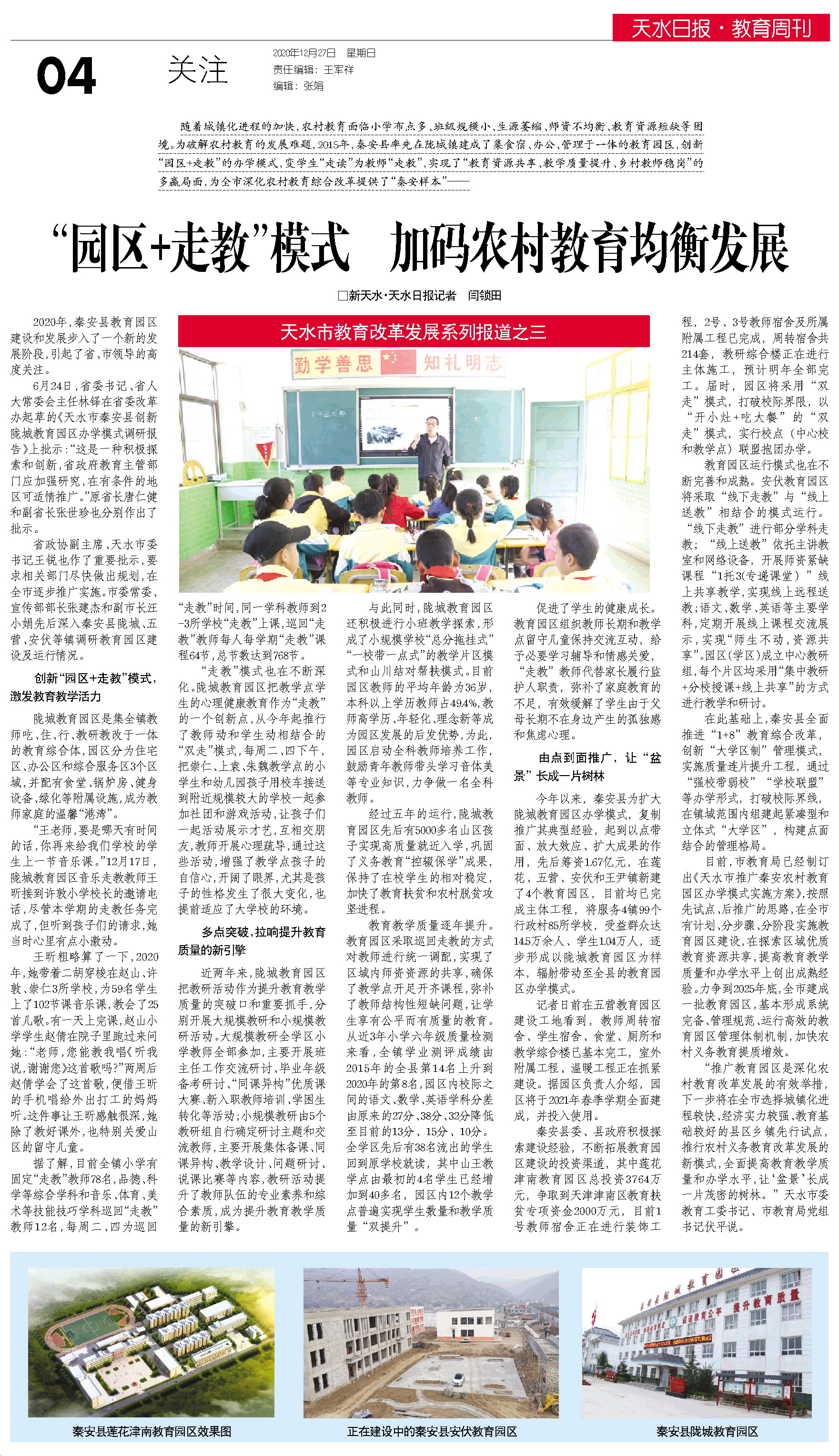 省政协副主席、天水市委书记王锐也作了重要批示,要求相关部门尽快做出规划,在全市逐步推广实施。市委常委、宣传部部长张建杰和副市长汪小娟先后深入秦安县陇城、五营、安伏等镇调研教育园区建设及运行情况。