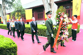 全国政协副主席马飚宣布公祭伏羲大典开始 省委书记、省人大常委会主任王三运敬献花篮 中国国民党荣誉副主席蒋孝严敬献花篮 省委副书记、省长刘伟平恭读祭文 省政协主席冯健身主持公祭大典 中共中央台湾工作办公室、国务院台湾事务办公室副主任龙明彪,中华全国归国华侨联合会副主席李卓彬,国务院港澳办公室交流司巡视员黄光敬献花篮。 省委副书记欧阳坚,省委常委、省委秘书长李建华,省委常委、省军区政委傅传玉,省人大常委会副主任马青林,省政府副省长夏红民,省政协副主席刘立军、栗震亚敬献花篮。 市党政军领导王锐、杨维俊、宋尚有、李建中、安永敬献花篮。 国家、省、市领导和海内外嘉宾步入公祭现场 鼓声激昂 乐舞告祭 |