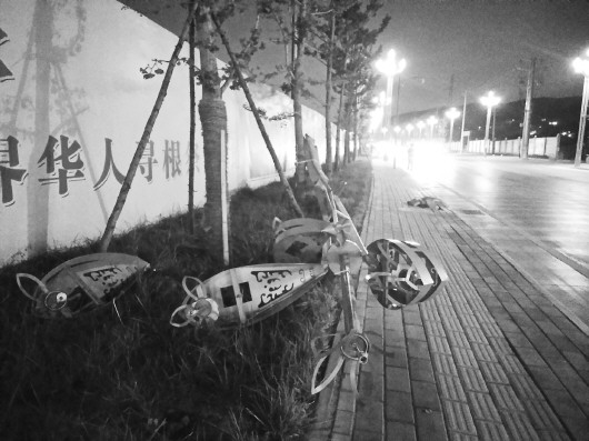 8月4日,在秦州区成纪大道公交碧桂园站附近,一盏已损坏的玉兰路灯倒在人行道边,底座部分被捆绑在行道树上,灯头部位则横躺在绿化草坪中,希望有关部门尽快予以处理。 本报记者 洪波 摄