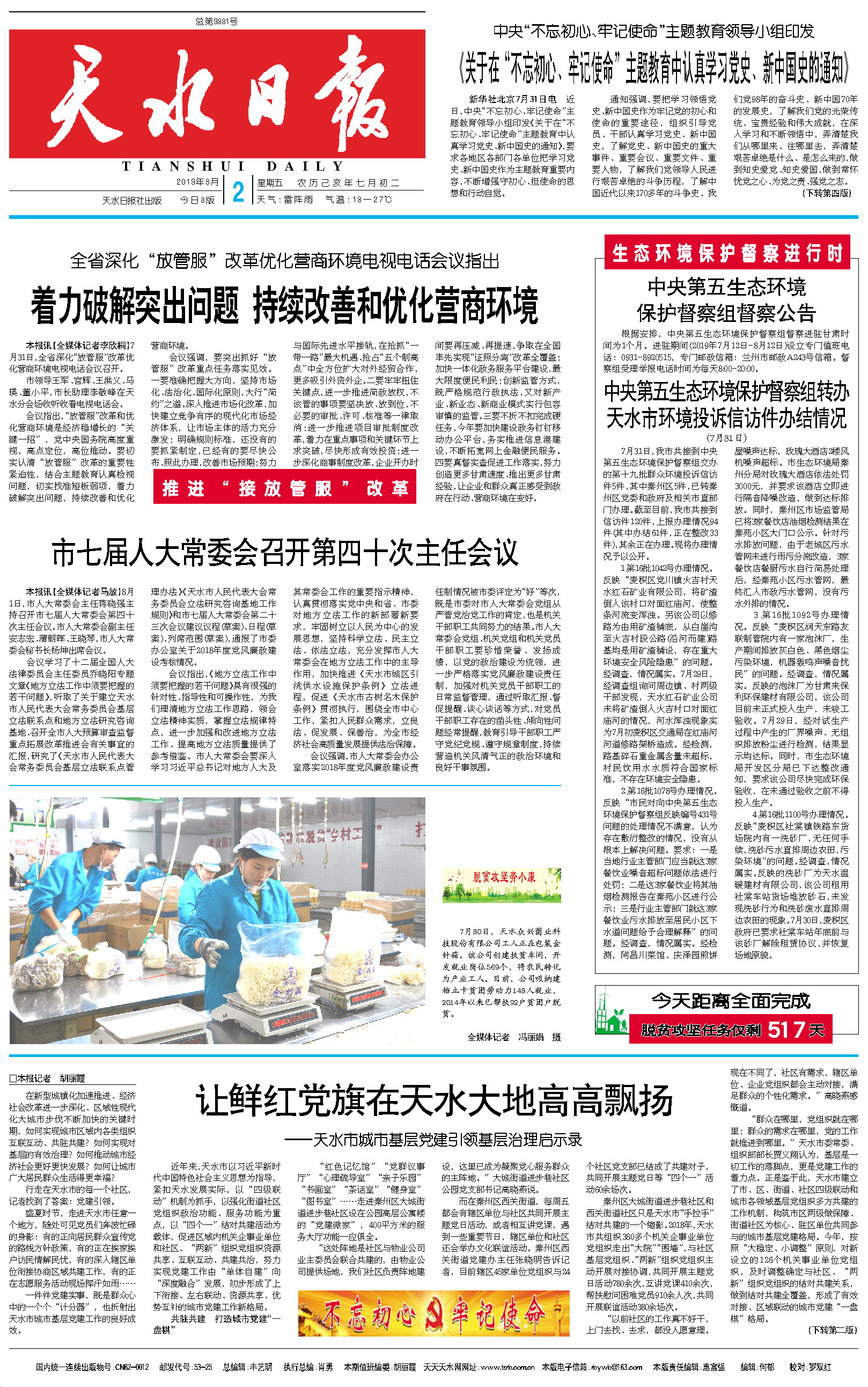 7月31日,我市共接到中央第五生态环境保护督察组交办的第十九批群众环境投诉信访件5件,其中秦州区5件,已转秦州区党委和政府及相关市直部门办理。截至目前,我市共接到信访件120件,上报办理情况94件(其中办结61件,正在整改33件),其余正在办理。现将办理情况予以公开。 1.第16批1042号办理情况。反映“麦积区党川镇火吉村天水红石矿业有限公司,将矿渣倒入该村口对面红庙河,使整条河流变浑浊。另该公司以修路为由用矿渣铺底,从白崖沟至火吉村段公路(沿河而建)路基均是用矿渣铺设,存在重大环境安全风险隐患”的问题。经调查,情况属实。7月29日,经调查组询问周边镇、村两级干部发现,天水红石矿业公司未将矿渣倒入火吉村口对面红庙河的情况,河水浑浊现象实为7月初麦积区交通局在红庙河河道修路架桥造成。经检测,路基碎石重金属含量未超标,村民饮用水水质符合国家标准,不存在环境安全隐患。 2.第16批1078号办理情况。反映“市民对向中央第五生态环境保护督察组反映编号431号问题的处理情况不满意,认为存在敷衍整改的情况,没有从根本上解决问题。要求:一是当地行业主管部门应当就这3家餐饮业噪音超标问题依法进行处罚;二是这3家餐饮业将其油烟检测报告在秦苑小区进行公示;三是行业主管部门就这3家餐饮业污水排放至居民小区下水道问题给予合理解释”的问题。经调查,情况属实。经检测,阿昌川菜馆、庆泽园煎饼屋噪声达标,玫瑰大酒店2楼风机噪声超标。市生态环境局秦州分局对玫瑰大酒店依法处罚3000元,并要求该酒店立即进行隔音降噪改造,做到达标排放。同时,秦州区市场监管局已将3家餐饮店油烟检测结果在秦苑小区大门口公示。针对污水排放问题,由于老城区污水管网未进行雨污分流改造,3家餐饮店餐厨污水自行简易处理后,经秦苑小区污水管网,最终汇入市政污水管网,没有污水外排的情况。 3.第16批1092号办理情况。反映“麦积区润天东路友联制管院内有一家泡沫厂,生产期间排放灰白色、黑色烟尘污染环境,机器轰鸣声噪音扰民”的问题。经调查,情况属实。反映的泡沫厂为甘肃来保利环保建材有限公司,该公司目前未正式投入生产,未竣工验收。7月29日,经对试生产过程中产生的厂界噪声、无组织排放粉尘进行检测,结果显示均达标。同时,市生态环境局开发区分局已下达整改通知,要求该公司尽快完成环保验收,在未通过验收之前不得投入生产。 4.第16批1100号办理情况。反映“麦积区社棠镇铁路东货场院内有一洗砂厂,无任何手续,洗砂污水直排周边农田,污染环境”的问题。经调查,情况属实。反映的洗砂厂为天水温暖建材有限公司,该公司租用社棠车站货场堆放砂石,未发现洗砂行为和洗砂废水直排周边农田的现象。7月30日,麦积区政府已要求社棠车站年底前与该砂厂解除租赁协议,并恢复场地原貌。 |